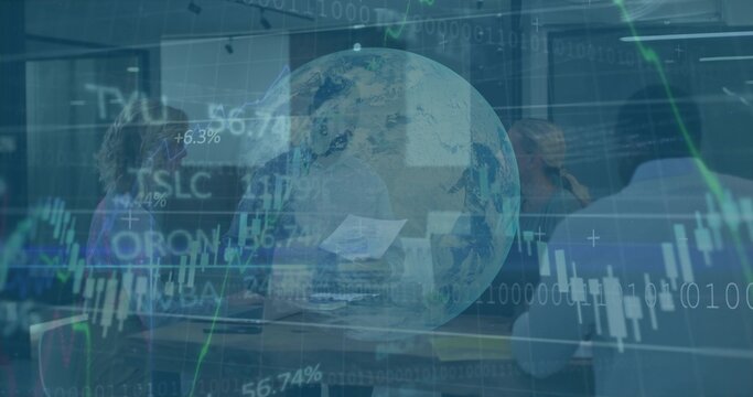 Overlaying globe and market charts over meeting room, colleagues in suits using laptops