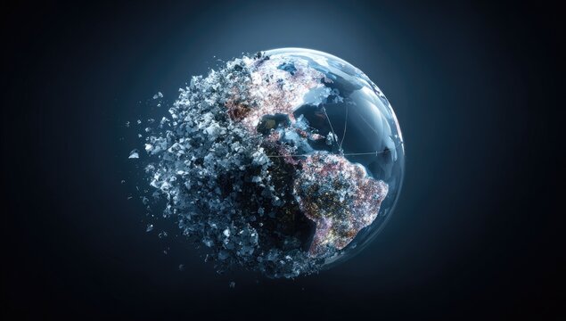 A shattered, translucent globe of Earth, its fragments dispersing against a dark background, evoking a sense of destruction and disintegration.