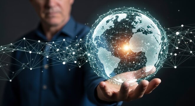 Global Connection: An abstract, conceptual design showcases a translucent globe, encircled by a halo, hinting at interconnectedness.  The composition conveys themes of international relations, data.