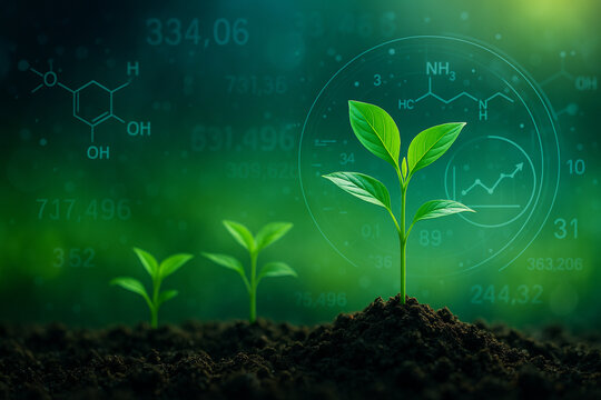 AI generated a vibrant green seedling emerging from rich soil surrounded by translucent molecular and data graphics symbolizing innovation sustainability and digital smart farming