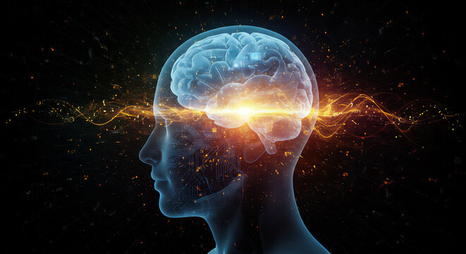 技術革新 知識とひらめきのほとばしり 人物の横顔 透ける脳 炎のような光の輝き  Innovation, a surge of knowledge and inspiration, a profile of a person, a translucent brain, a flaming glow of light.