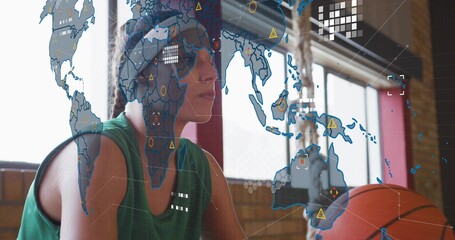 Displaying translucent world map on digital interface, showing double helix and data visualizations