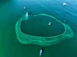 Aerial view of fishing boats encircling a vast, translucent green net in the deep turquoise sea, creating a mesmerizing contrast of color and texture, An Ninh Dong, Phu Yen, Vietnam.