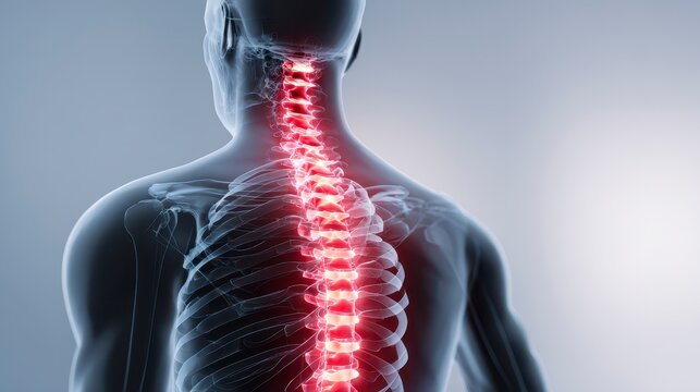 Medical illustration showing a glowing red spine in the translucent back of a human figure. The spine's detail is prominent. The background is a gradient gray