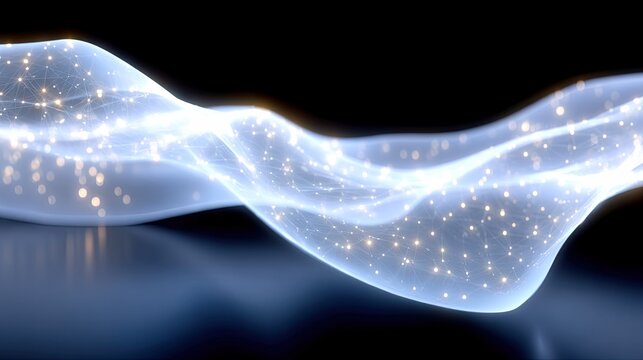 An abstract, flowing, translucent white wave-like structure with numerous small, glowing yellow nodes embedded within it. The background is dark and blurred, cr