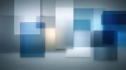 Layered translucent rectangles in blue and gray tones forming a balanced geometric composition, representing clarity, structure, and digital minimalism