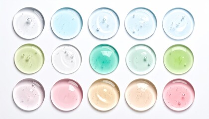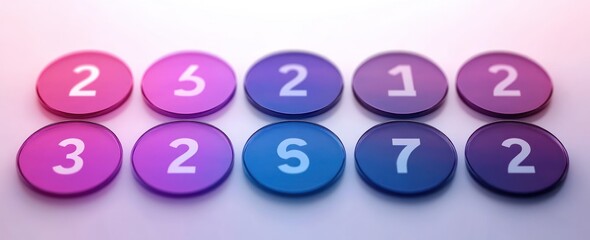 Colorful translucent discs with white numbers arranged in two rows on a soft gradient surface with pink and blue hues