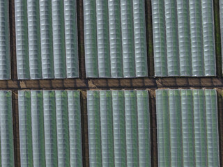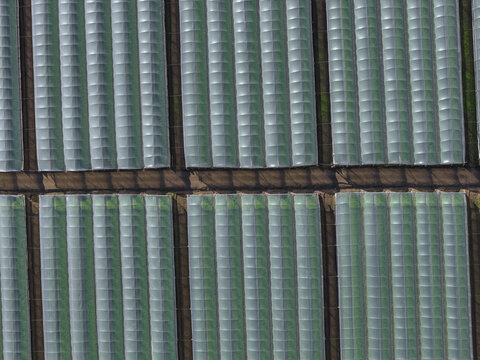 Aerial view of rows of greenhouses create a geometric pattern, their translucent roofs reflecting the sky above the fertile fields, Paestum, Campania, Italy.