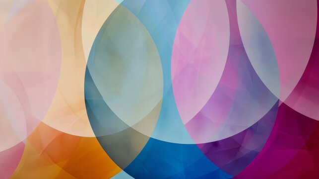 A vibrant abstract art piece with overlapping translucent shapes in various pastel colors, creating a harmonious blend of hues and forms.