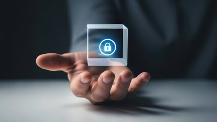Illuminated translucent cubic digital interface displaying a white padlock symbol within a vibrant blue circular background, is gently held in the open palm of a person wearing a dark suit, bathed in