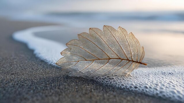 A delicate translucent leaf skeleton rests on wet sand as white sea foam washes along the shore. Concept Translucent leaf skeleton on wet sand, White sea foam washing the shore