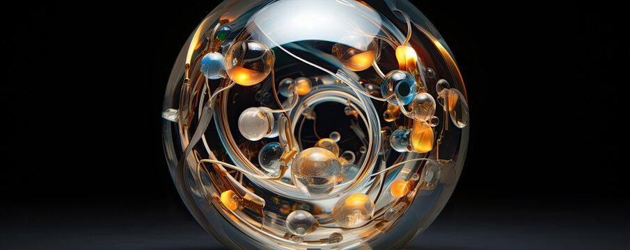 Futuristic glass sphere with green filaments glowing on reflective surface