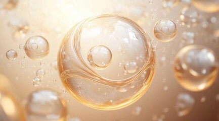 Golden translucent spheres with suspended micro air bubbles, forming a refined abstract composition suitable for wellness advertising, beauty product showcases, and futuristic design concepts