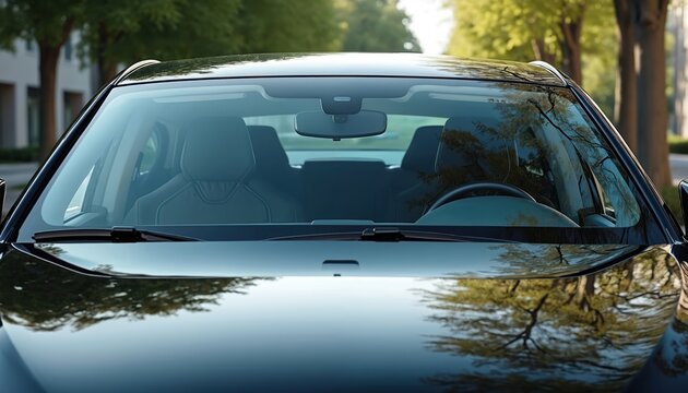 Car windscreen view shows interior with seats. Exterior car photo features a clear windshield with reflections of trees. Design mockup for advertising auto industry or transportation themes.