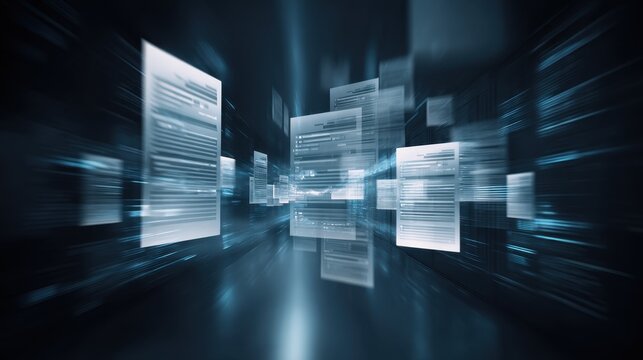 Futuristic Data Flow with Floating Transparent Documents in a Cyber Space Environment, Illustrating Digital Information Movement and Technology Advancement