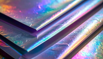 Close-up of iridescent foil sheets, displaying stacked edges with shifting colors and textures
