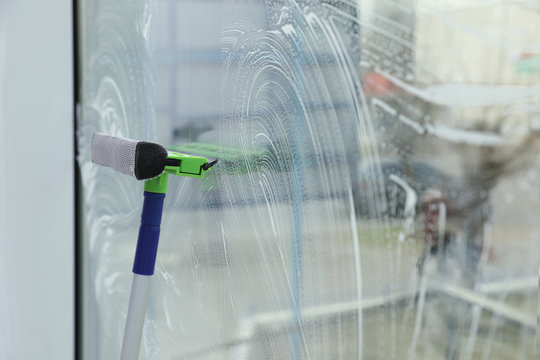 Cleaning window with squeegee indoors. Space for text