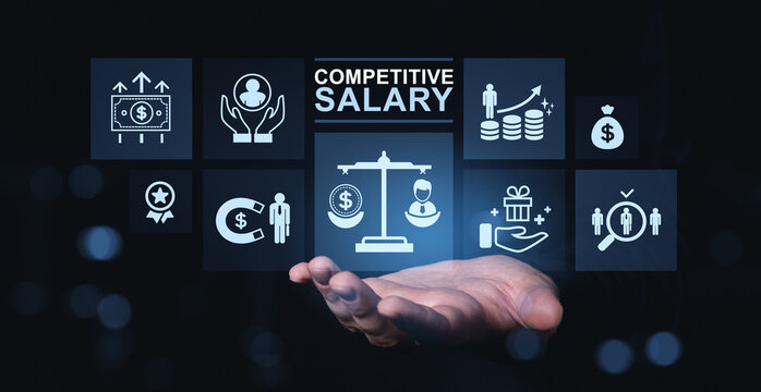 Human hand supports floating icons representing competitive salary, job benefits, and career growth on a dark background in modern digital style.