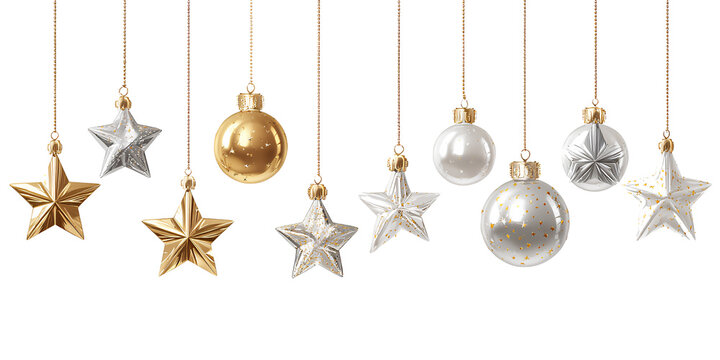 PNG set of hanging christmas decorations, gold and silver stars and balls isolated on a transparent