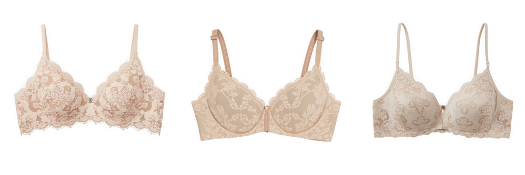 Three different styles of beige lace bras are displayed on a transparent background in a studio shot