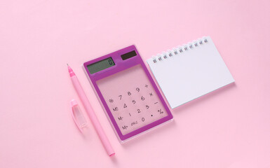 Transparent calculator and notebook with pen on pink background. Business concept.