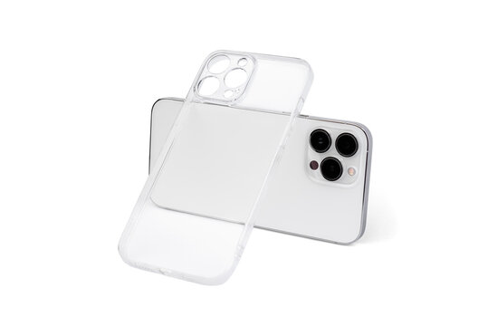 White smartphone in clear silicone case back view. iPhone 11 case mockup isolated on green background