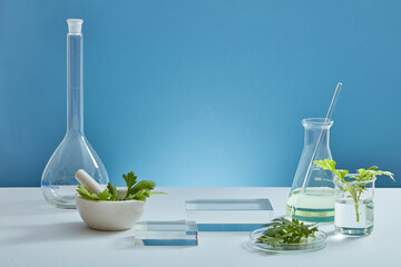 Mugwort decorated with transparent podium and beaker test tube in blue background with blank space for mugwort experiment advertising
