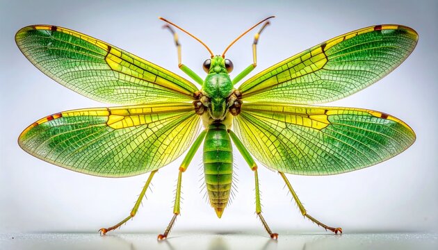 Vibrant green grasshopper with spread wings, symmetrical pose, detailed anatomy on white backdrop.