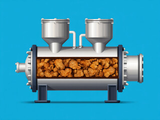 Industrial machine processing popcorn kernels inside a transparent chamber against a blue background.