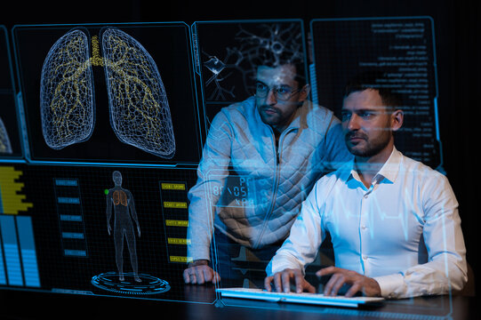 Senior physician interacting with holographic patient vitals on augmented reality display
