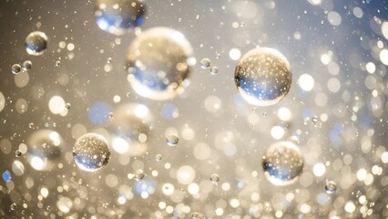 Ethereal orbs suspend in liquid matrix, glistening with light and creating unique bokeh background