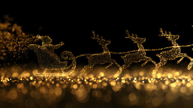 The silhouette of Santa's sleigh and reindeer, created from golden bokeh glitter particles. Abstract and magical, for a transparent PNG background.