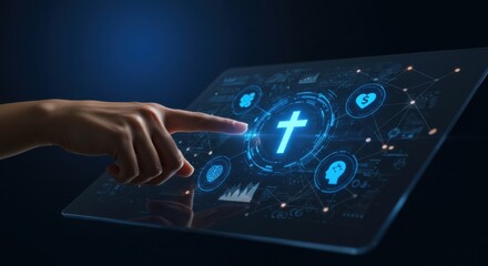 Hand selects a cross icon on a transparent screen with icons symbolizing different spheres of life. Concept of Christianity in the modern world. Church and modern technologies.