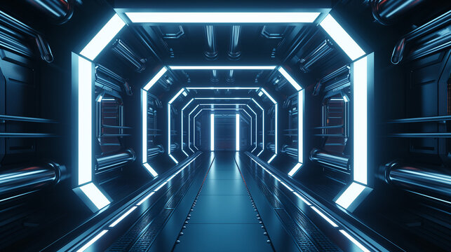 Futuristic hallway or corridor on a space station or large ship illuminated by lights