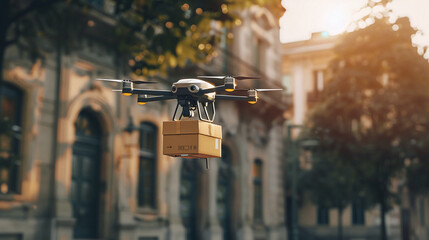 An advanced delivery drone flies through a snowy urban landscape, transporting a package for a customer.