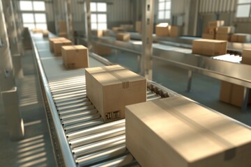 Efficient warehouse fulfillment center with conveyor belt transporting cardboard box packages