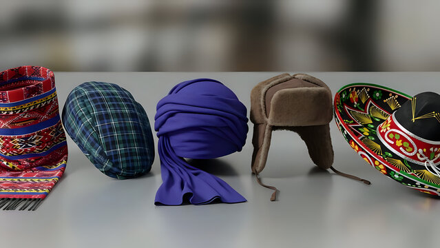 Collection of diverse headwear including a patterned scarf a plaid flat cap a purple turban and a ushanka hat
