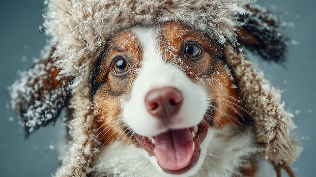 Happy puppy in furry ushanka with snow, close up, expressive eyes, winter atmosphere, studio lighting, portrait, celebration.