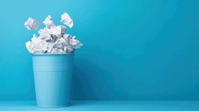 Blue Trash Can Overflowing with Crumpled White Paper on Vibrant Turquoise Background