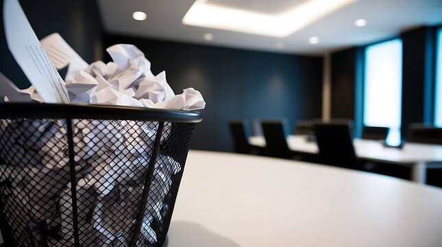 Close-up of a bin overflowing with crumpled sheets of paper in a contemporary office boardroom, representing problem-solving struggles, brainstorming failures, or decision-making processes