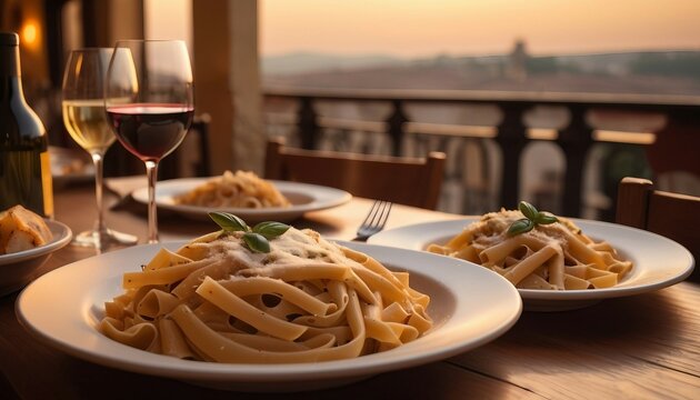 A cozy Italian trattoria with a table set for two, featuring a bottle of red wine