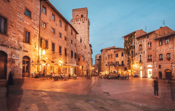 Shadows from moving tourists at evening in beautiful ancient town of Tuscany