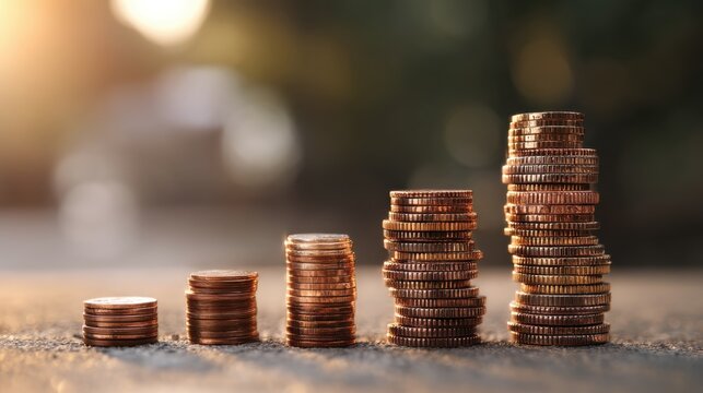 Stacks of coins representing financial growth, savings, investment, and wealth accumulation, highlighted by warm sunlight in a soft blurred background