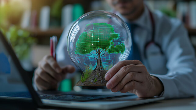 A person typing on a keyboard with a glowing digital tree emerging from the screen, symbolizing the growth of artificial intelligence and data science, surrounded by binary codes and digital elements.