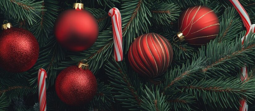 Craft background featuring a close up of a Christmas tree and ornaments Empty space for text Red Christmas ornaments spruce branches and cane shaped candies Christmas themed background