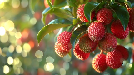 Close-up of a cluster of pinkish-red fruit growing on a branch with lush green leaves, bathed in sunlight against a blurred backdrop