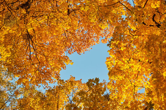 Majestic tree with lush green leaves and blue sky, bottom view of tall tree with textured dark brown bark, branches covered with abundant green leaves, spreading to the sides, forming a wide crown