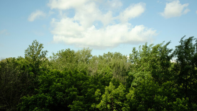 Beautiful lush tree crowns against the blue sky. Autumn or summer landscape in forest, background, texture. Forest in golden colors in autumn.