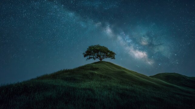 Lone Tree on Hill: A solitary tree crowns a vibrant green hill, standing against a dark blue, creating a striking contrast.
