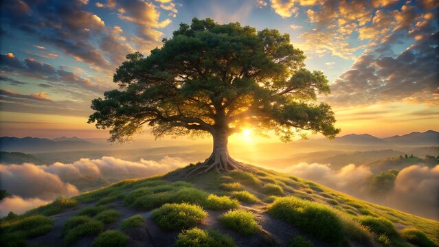Serenely majestic solitary tree crowns lush emerald hill, symmetrical branches stretching towards radiant sky, evoking peaceful solitude and nature's beauty.